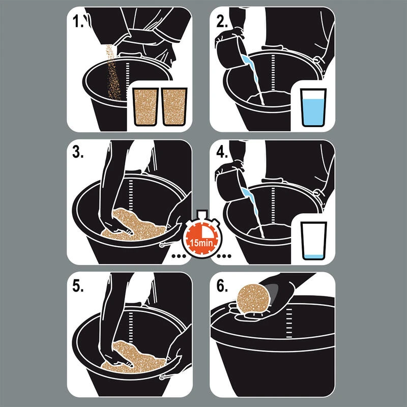 On commence tout d’abord par verser les 3/4 du volume d’eau nécessaire en mélangeant énergétiquement avec la main dans un seau rond pour permettre aux particules de l’amorce de se gorger d’eau.