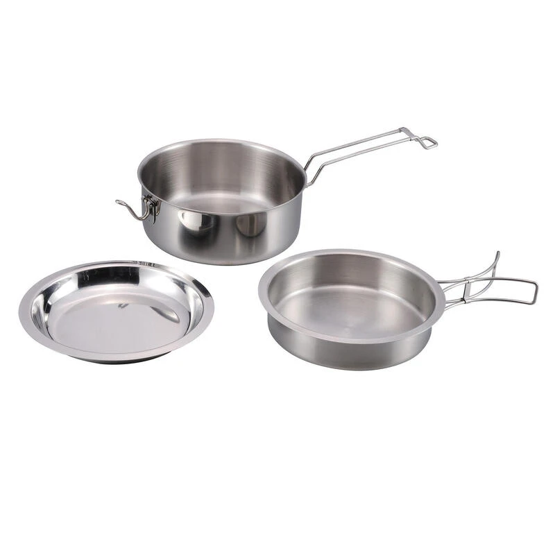 Ensemble de casseroles en acier inoxydable pratique et robuste, comprenant une casserole, une poêle et une assiette profonde. La casserole et la poêle ont des poignées pliables.
